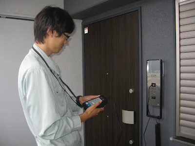 各住戸のすべての部屋に火災探知機がついており、このチェックは各住戸の玄関にある点検接続点に点検器を繋ぐことにより可能になっている。住戸の中に入る必要はない。すべての住戸の点検の結果、問題なかった。